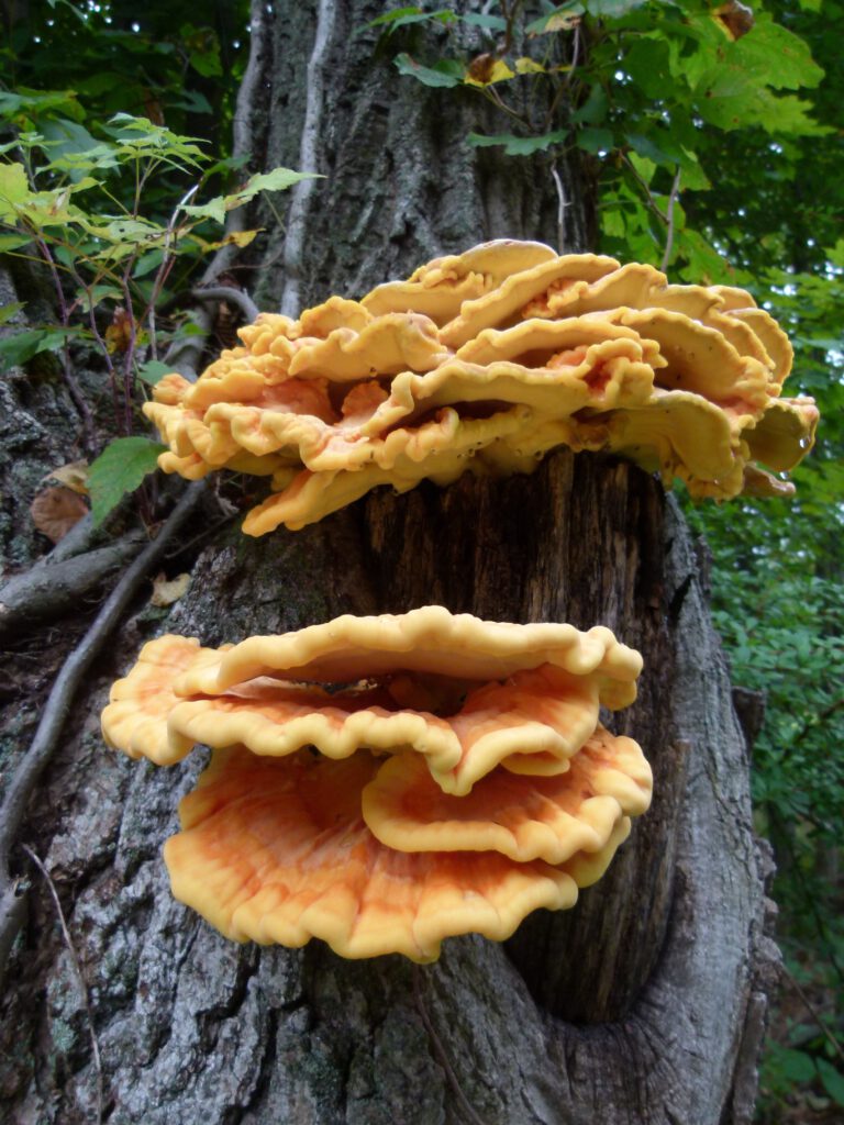 Also known as Laetiporus sulphureus, is a fungi the commonly grows on tree trunks which taste and texture share a strong resemblance to the white meat of the chicken.